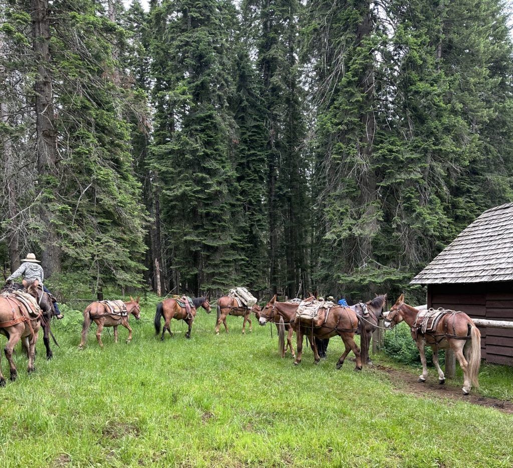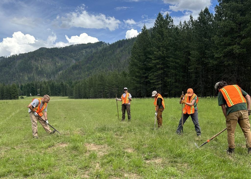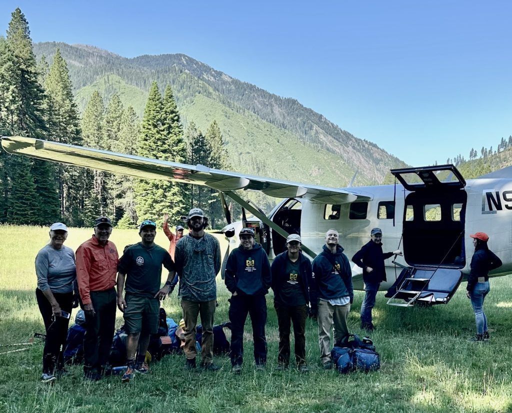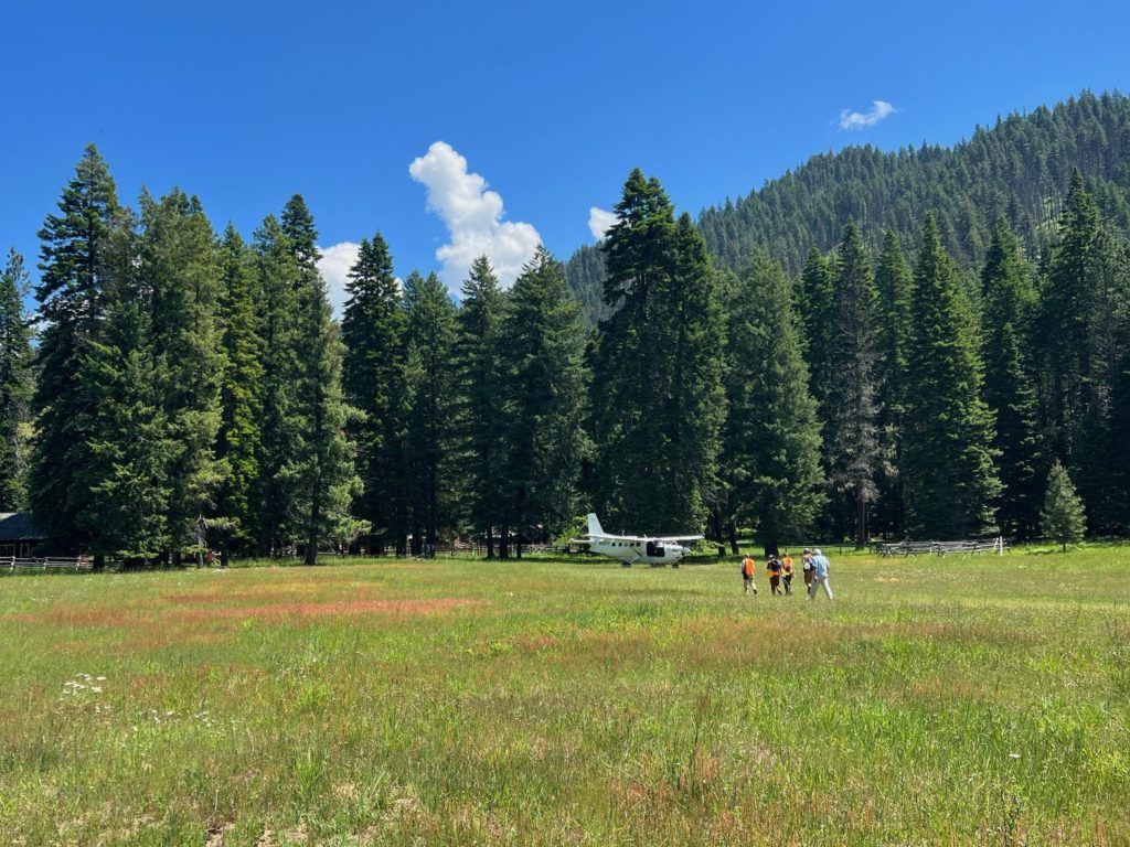 Because the Wilderness Act restricts mechanized tools, everything now must be done with hand tools or by a mule team pulling 19th century equipment. Three years ago, the RAF began assembling a plan with the Forest Service to do some needed maintenance on both runways. Using rural airstrip funding, the RAF began the effort this June, by hiring a Montana Conservation Corps (MCC) trail crew (funded by AmeriCorps) to help move dirt onto the low areas of both runways and create water diversions to prevent erosion. Just in time, Daher offered to help with the project by donating the use of one of their Kodiaks, and, as a result, equipment donated by Dave Normandeau of Thompson Falls, MT, (along with Dan and Pete Normandeau), and a runway crew were moved into Moose Creek in two days rather than weeks by other means. Over two days, the MCC crew along with RAF volunteers, moved 54 loads of soil from the tree line to the centerline of both airstrips, a water bar was installed at the head of runway 24, and a new windsock was installed at the other end. Pilot reports have since noted these improvements. The RAF isn’t done – but we have taken a big step forward. Next comes some heavier work with a mule team and dirt moving equipment.
