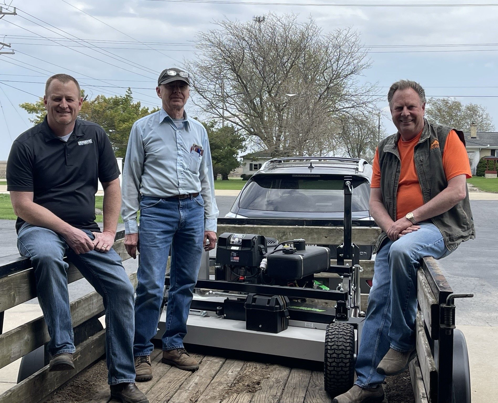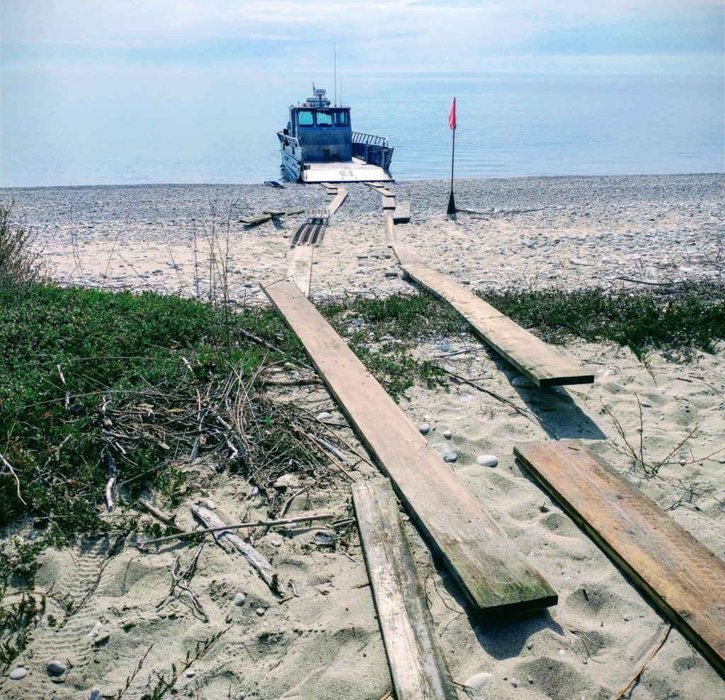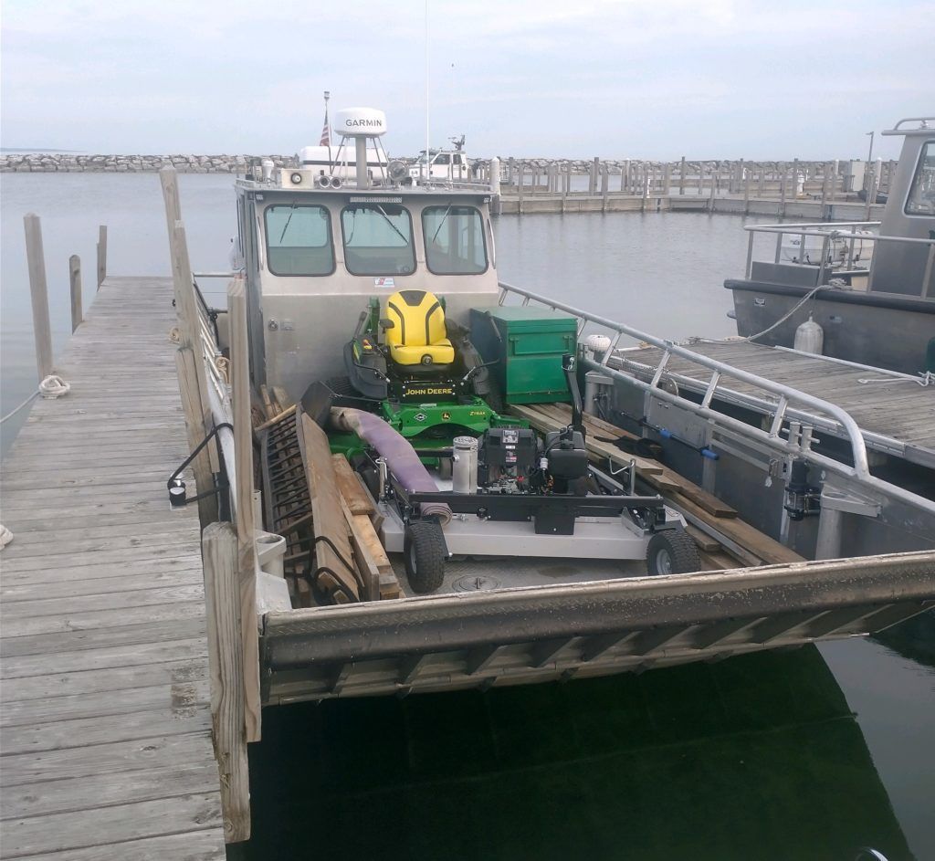 That’s when resourceful RAF volunteers rose to the challenge. RAF Director Jeff Russell of Wisconsin, RAF volunteer Jerry Ness, and RAF Michigan Liaison General Grant started making plans. Russell and RAF supporter Rick Rettler drove the 12 hour round trip from Wisconsin to Luverne and back. “We tested the mower locally, then General hauled it to Escanaba, Michigan. Jerry hauled it to Leland, where Geoff Niesink, a contractor with a landing craft boat, waited for relatively flat water. He was able to ship it to the island on May 12,” Russell explained. “And it was a relay all the way.” Accompanying Geoff on the boat ride were Jerry and longtime RAF volunteer George Stevens.