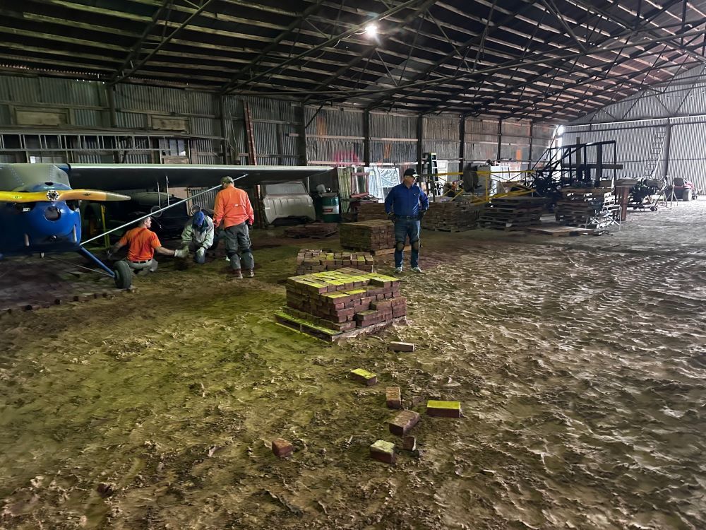RAF Texas Liaison Jeremy Harris organized volunteers, and 22 showed up to help, including RAF Texas Ambassadors Steve Maus, Chuck Howard and Mike Hergenrather; and RAF Oklahoma Liaison Steve Thompson. The weekend project consisted of removing and palleting 15,800 bricks from the floor. A vapor barrier and concrete slab will later be poured; eventually each brick will be cleaned and re-positioned. Calvert also plans to replace the 18 original six-foot high windows. New trusses have been ordered, and the building will be re-sided entirely in the spirit of the original hangar.