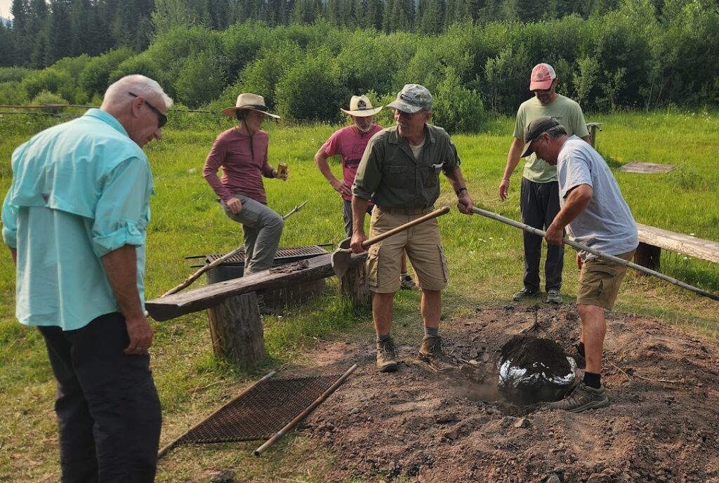 “As always, Loren Smith from Great Falls provided the dinner,” Newpower said. The meal was flown in by Pete Smith and Jeff Patnode from Lewistown. “Working the underground oven this year was Pete Smith, Scott Kirsch, Brad Young and Mark Bailer,” Newpower added.