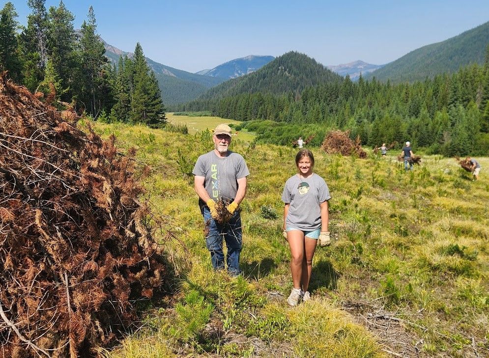 Newpower and RAF supporter Mitch Fontenot flew in a picnic table that volunteers assembled. Workers raked and smoothed dirt mounds caused by animals and filled gopher holes. During last year’s work party, the crew had cut down several hundred small pine trees. This year, the volunteers gathered them in piles to be burned by USFS crews when burning conditions are favorable. Fynnley Dyk and her grandfather TJ Reynolds helped on that project. The outhouse was cleaned, and a small stream was cleared of overgrown grass to help prevent flooding. Both windsocks were also replaced.