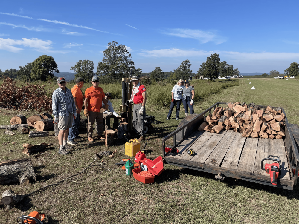 “Perfect October Ozark weather welcomed about twenty volunteers who descended, literally, on Trigger Gap Airfield for a weekend work party,” RAF Arkansas Liaison Harper Goodwin reports. Some drove in, and about 15 airplanes arrived with volunteers, their gloves, tools, chainsaws, and tents on Saturday, October 11.
