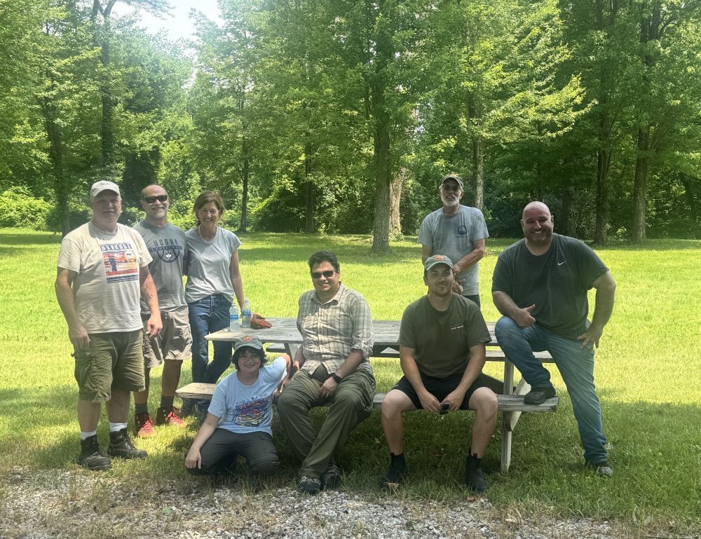 The recent work party was plagued by heat and “pop-up” thunderstorms but the group accomplished many tasks. They did all the weed whacking requested by the owners, and mowed around fire pits and tent platforms, making them safe to use for the season. Some spread wood chips along the stairway to the airfield and sprayed weeds. An outhouse gutter was installed for rainwater collection. They cleaned all the picnic tables and outhouse woodwork, and installed the new composite floor in the shower.
