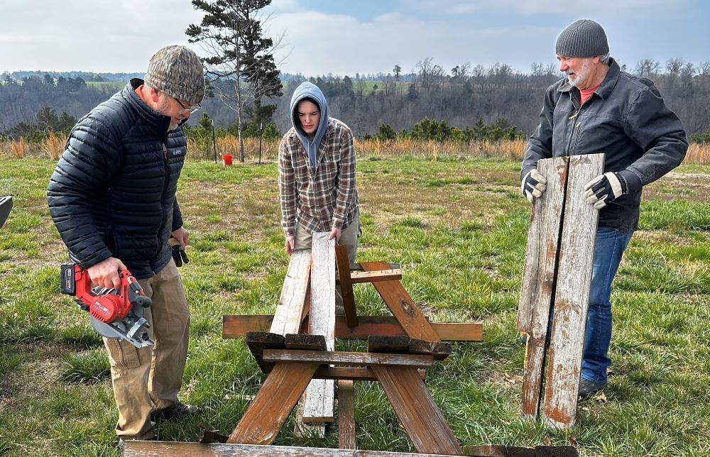 In February, Goodwin had selected and arranged the planting of seven Nuttall Oaks, “substantial trees that will provide beauty and shade for a hundred years.” And the trees needed tending to ensure they’d thrive. Nine volunteers braved March’s wind chill to stake and form water wells for the new trees. They cleared thousands of rocks, smoothed and filled in low spots, spread grass seed, and generally cleaned up the grounds. A team removed a deteriorating picnic table and assembled two new metal ones. “We had a really good time doing it,” Goodwin added.